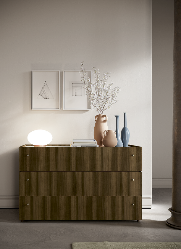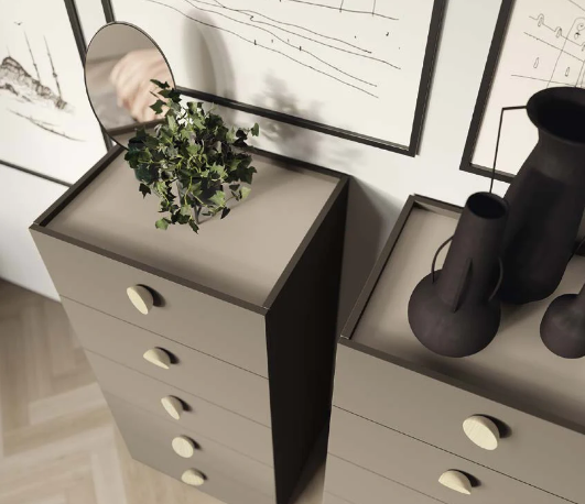 Sertarele au ghidaje metalice de tip "Quadro" cu inaltime reglabila, oferindu-ti posibilitatea de a accesoriza noptiera cu manere la alegere.