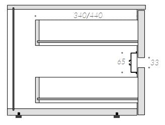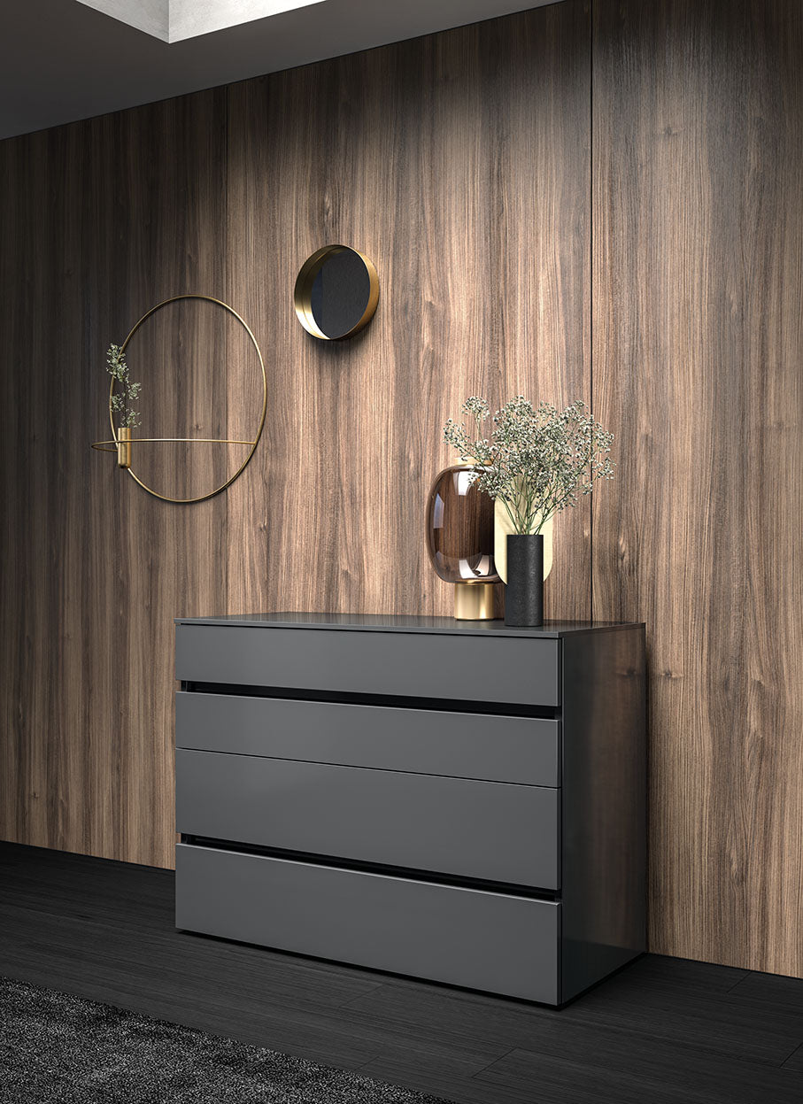 Comodă echipată standard cu șine de extracție parțială cu apăsare pentru deschidere.