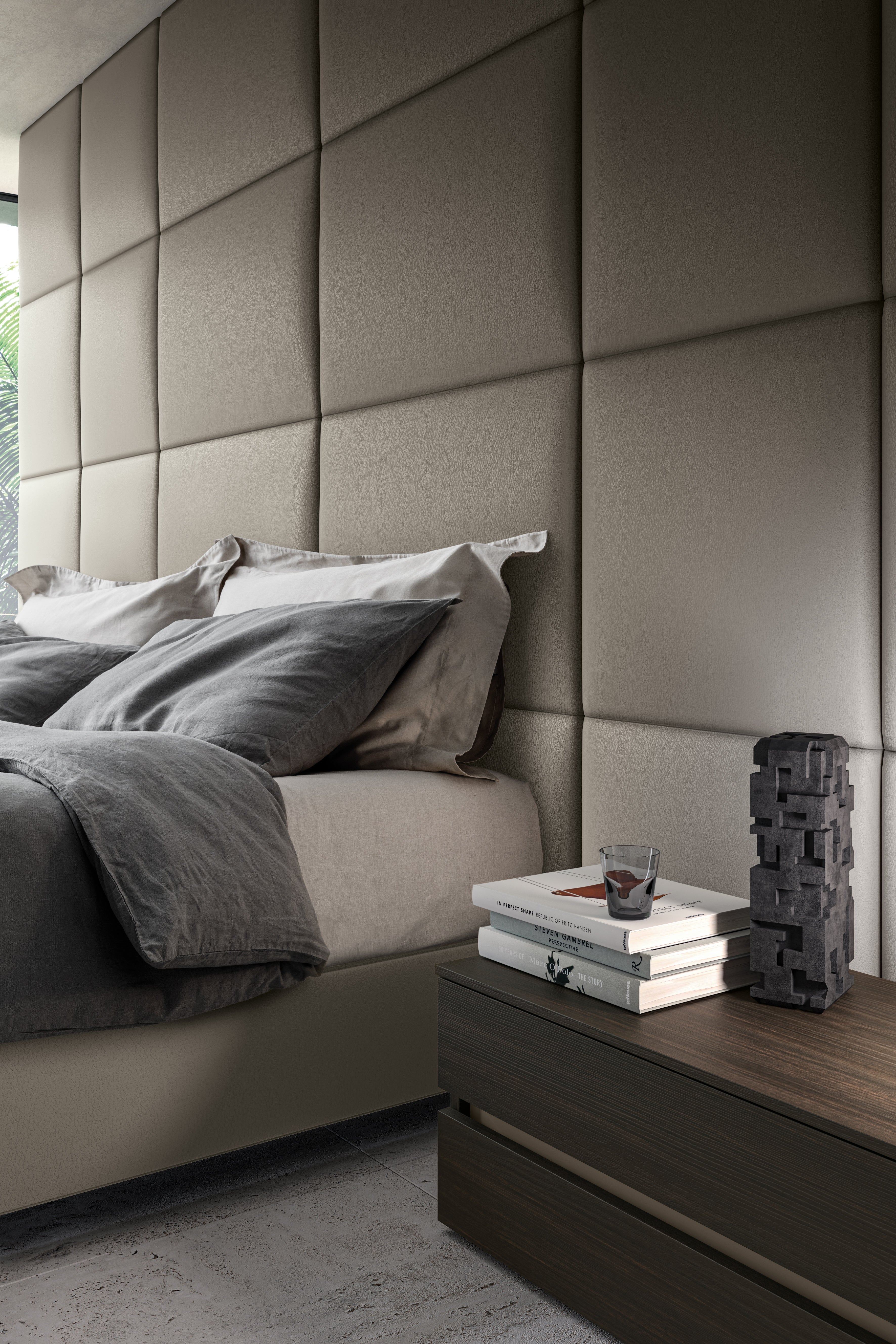 Grup de pat Rio compus din noptiere, comode si sertare, cu deschidere cu profil Gola.