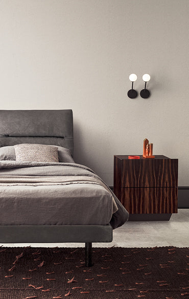 Sofisticat și neconvențional la fel ca și setul de bufete cu același nume, noul mobilier de dormitor Tosca confirmă atenția acordată detaliilor rafinate. Volumele solide și contrastele texturate transmit o frumusețe solidă și atrăgătoare. Sertarele sunt punctate de fronturi mari, proeminente. Înclinarea la 45° a acestor panouri facilitează deschiderea fiecărui sertar, dezvăluind un finisaj interior care se poate asorta sau contrastează cu exteriorul. Gama de finisaje disponibile este cu adevărat extinsă și include lemn de trandafir exotic și abanos. Baza este disponibilă în finisajele metalice, precum și în culorile lac lucios și mat ale colecției Pianca. Înaltă și conică, baza susține structura și completează designul general cu caracterul său îndrăzneț și distinctiv.