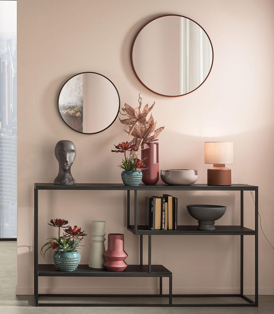Oglinda rotunda din metal negru. Un accesoriu de mobilier cu o eleganță minimă pentru a vă mobila și ilumina camerele. Disponibil în roșu Merlot și, de asemenea, în mărime mare.