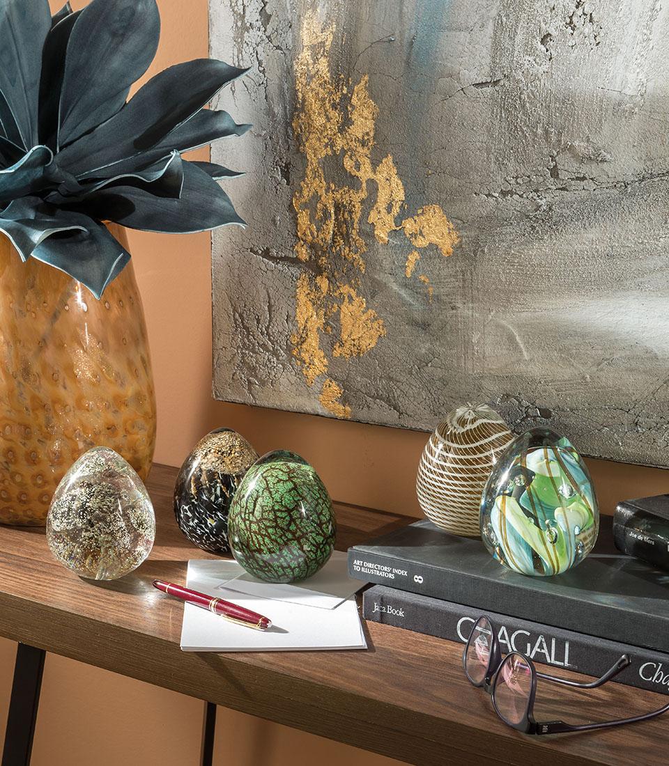 Opritor de carte din sticla, ornament decorat cu detalii in diverse nuante de verde. O piesa de mobilier moderna si rafinata. Pentru a fi combinat cu celelalte ziare de presă ale lumii contemporane pentru un fil rouge elegant.