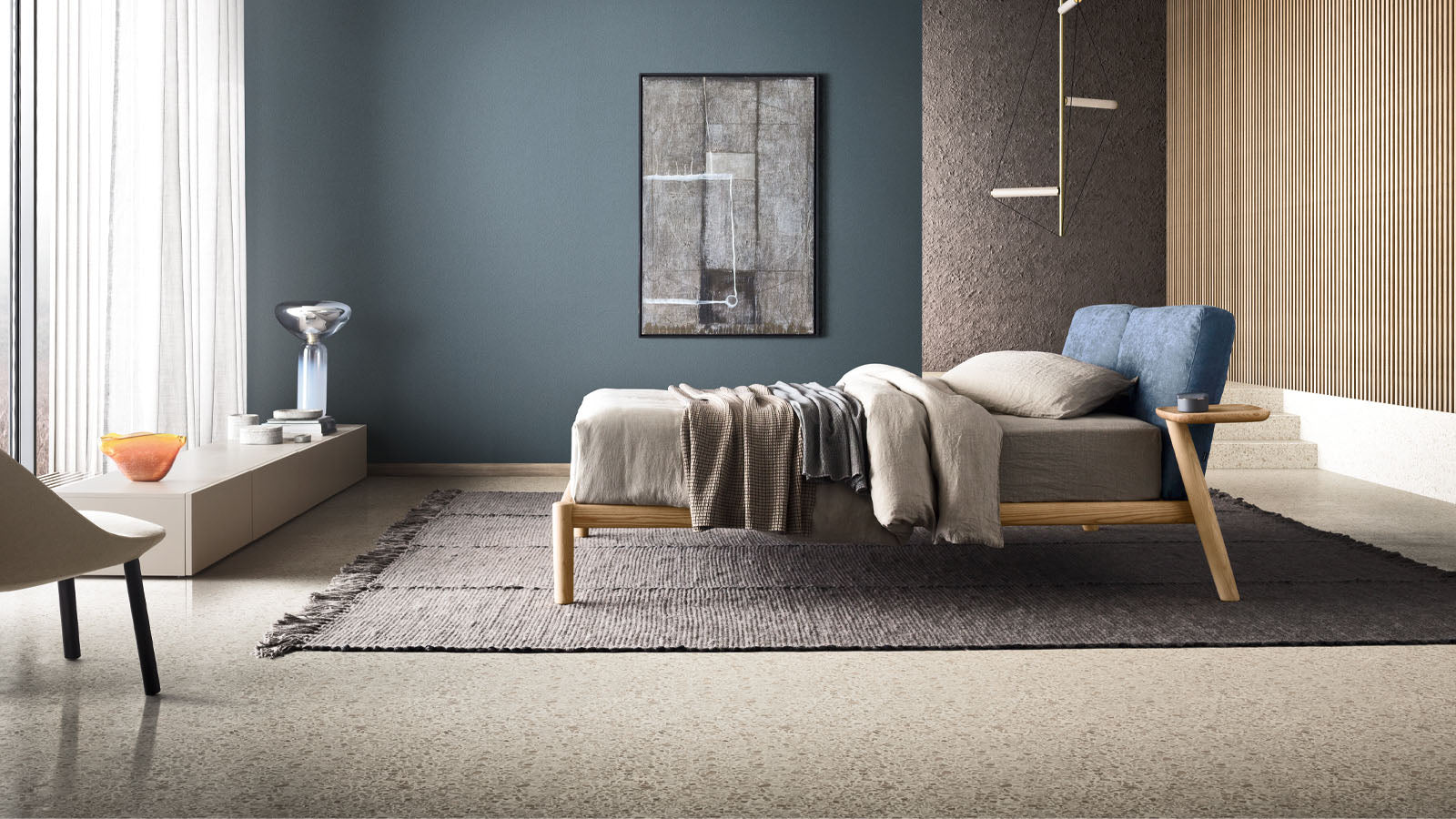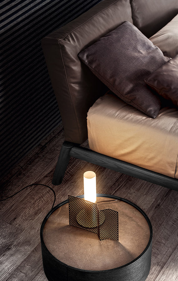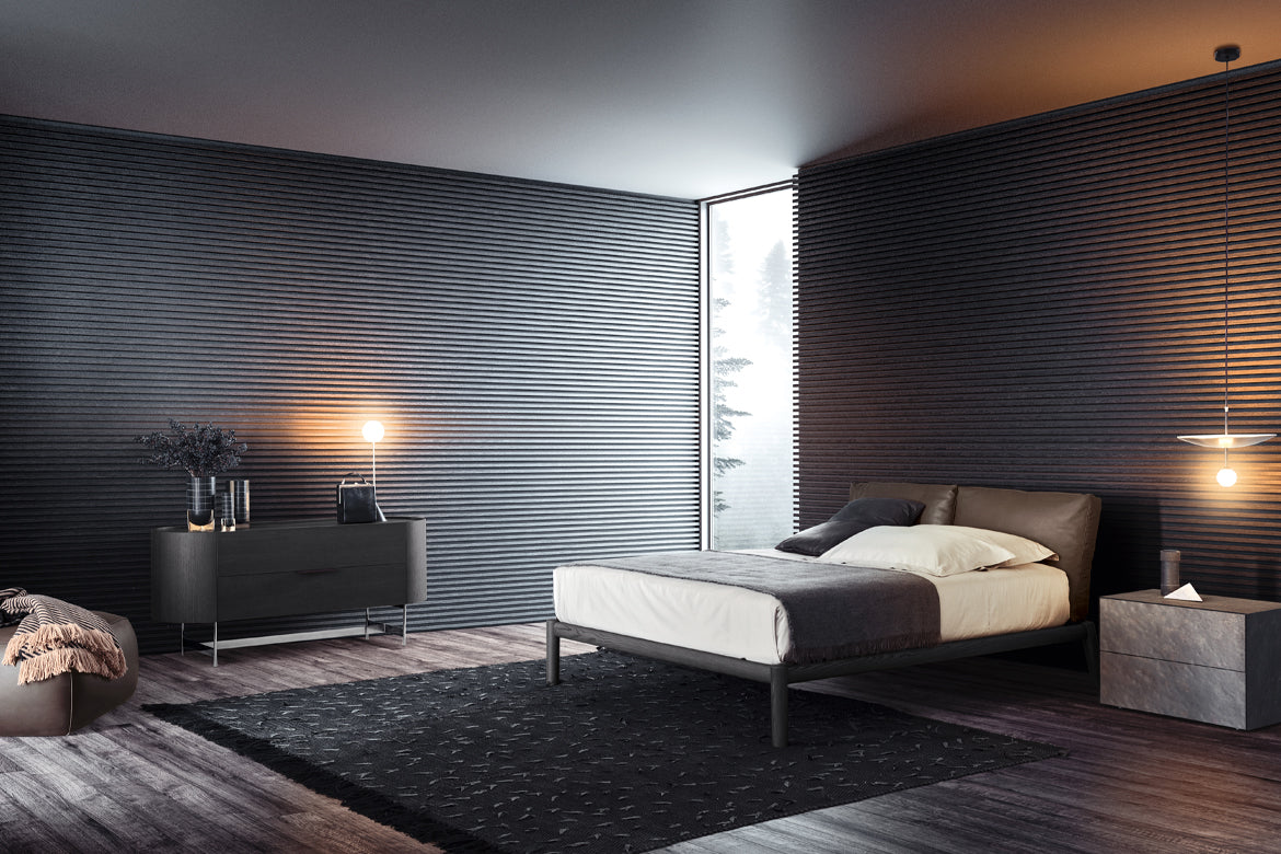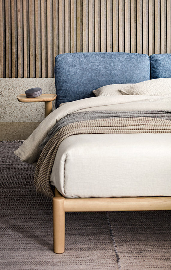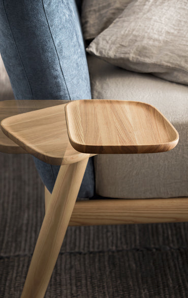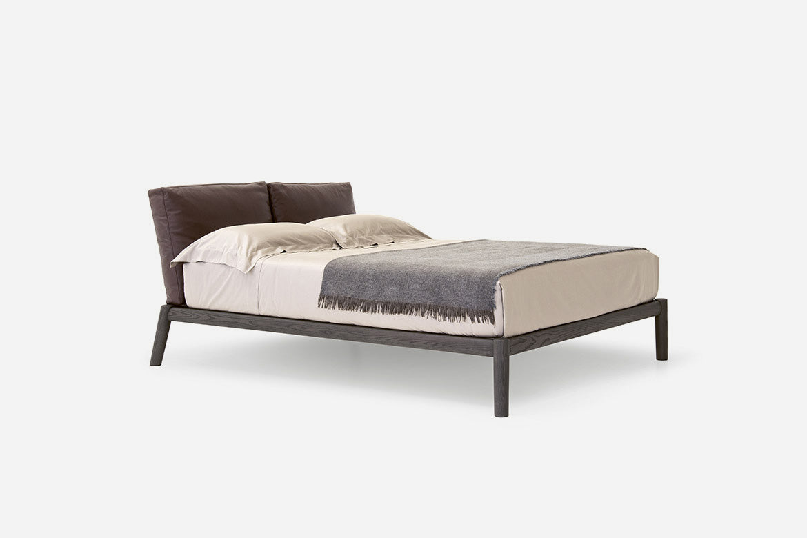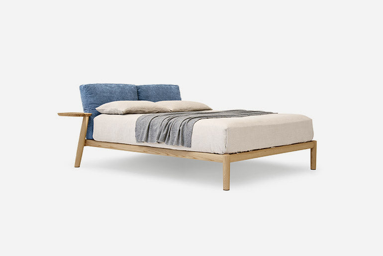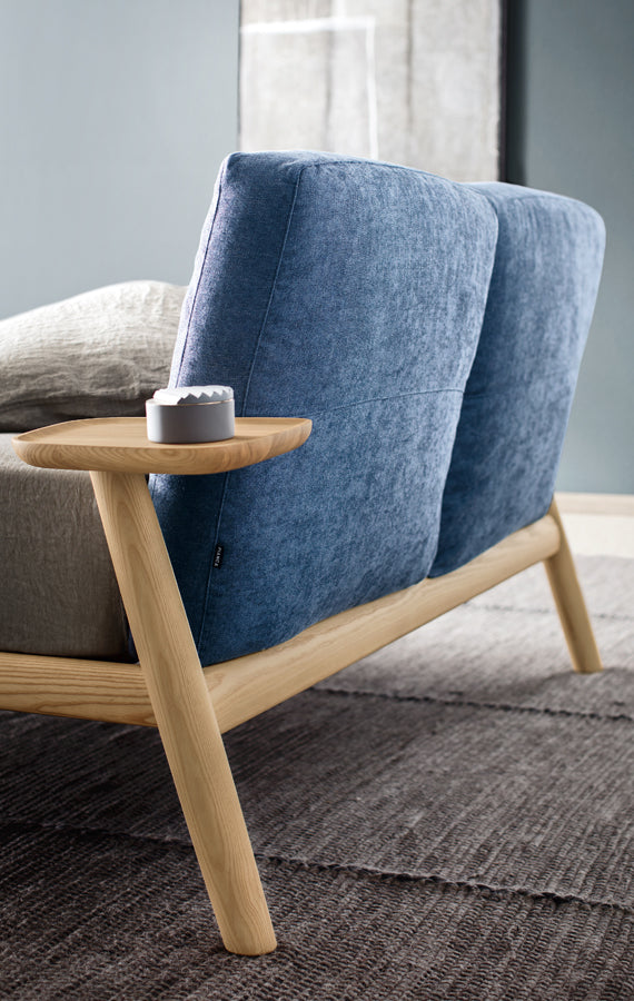 O simplitate predominantă și convingătoare. Un rafinament care se exprimă în detalii și care invită la contact. Măiestria lemnului masiv îmbină un design cu linii solide și conice, asigurând o tactilitate dulce. Pernele mari umplute cu puf alcătuiesc tăblia, un suport moale pentru cei care se odihnesc. Înclinarea picioarelor din spate în varianta cu tăvi laterale este apreciabilă: rafturi practice rotative, mereu la îndemână.
