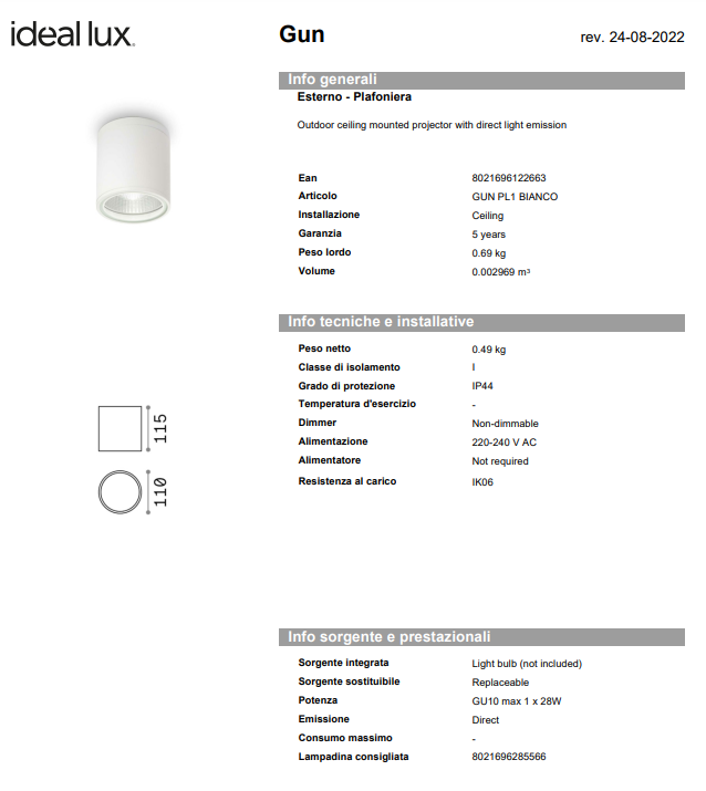 Corp de iluminat din aluminiu cu finisaj natural periat sau din vopsea cu diverse finisaje. Difuzor din sticla Pyrex transparenta. Ø 110 x H 115mm