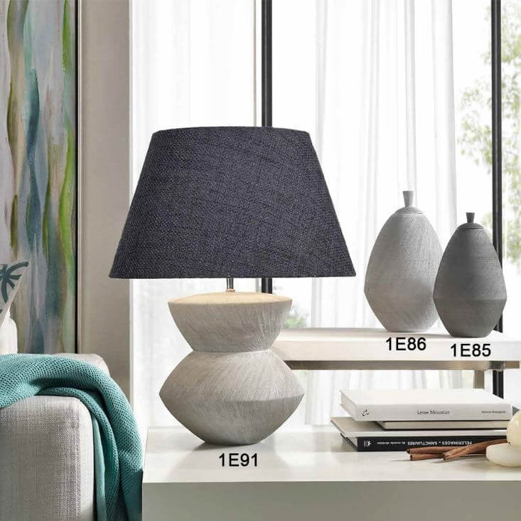 Veioza cu abajur din material textil si suport din ceramica, cu design industrial modern.