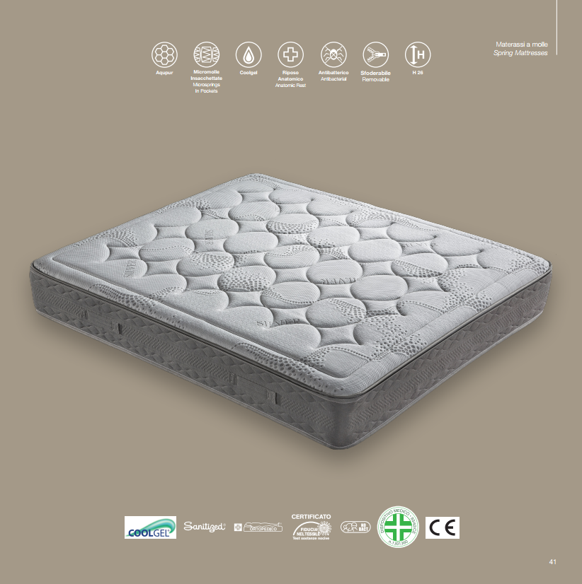 O componentă importantă a sistemelor de pat este cu siguranță salteaua, trebuie să fie capabilă să garanteze tuturor confortului deplin în fiecare noapte. Vino în showroom pentru a vedea direct inovația care distinge toate produsele de înaltă calitate semnate de renumitul brand, excelență în sector. Cea mai bună saltea de la Manifatture dell'Adriatico cu arcuri impachetate, adică un produs de calitate și confort deosebit, vă asigură toată excelența în lumea lenjeriei de pat. Un grad ridicat de confort, materiale fine și tehnologie de ultimă oră fac din această propunere aliatul fundamental al odihnei. Saltelele cu arcuri duble oferite de Manifatture dell'Adriatico asigură o primire plăcută în fiecare seară, precum și un sprijin optim pentru coloana vertebrală.