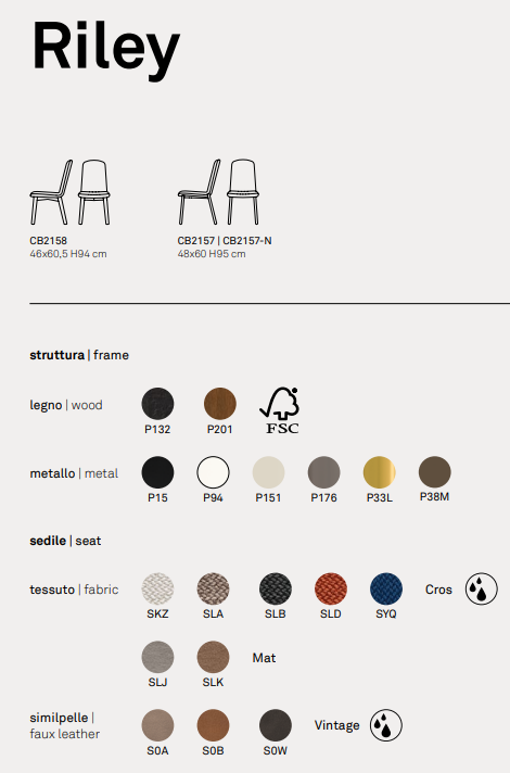 Familia Riley se mărește și datorită adăugării unui scaun moale ca un nor. Acest scaun are o bază cu 4 picioare din lemn și un spătar înalt, fiind potrivit atât pentru uz casnic, cât și pentru articole contractuale. Scaunul este din placaj căptușit tapițat cu material textil. Detaliile cusături de pe spătar creează un model subtil ondulat și o textură rafinată atractivă.