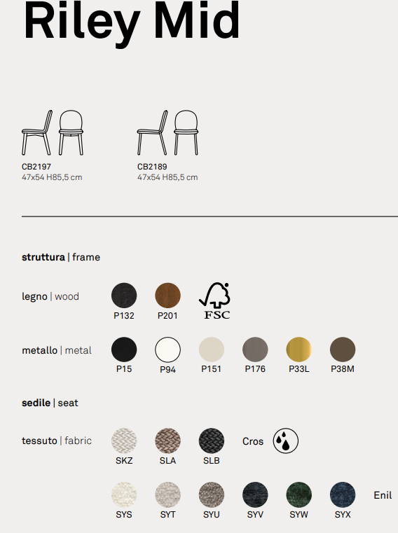 Scaunul Riley Mid are un spătar lat și jos, cu o formă rotunjită și picioare din metal.