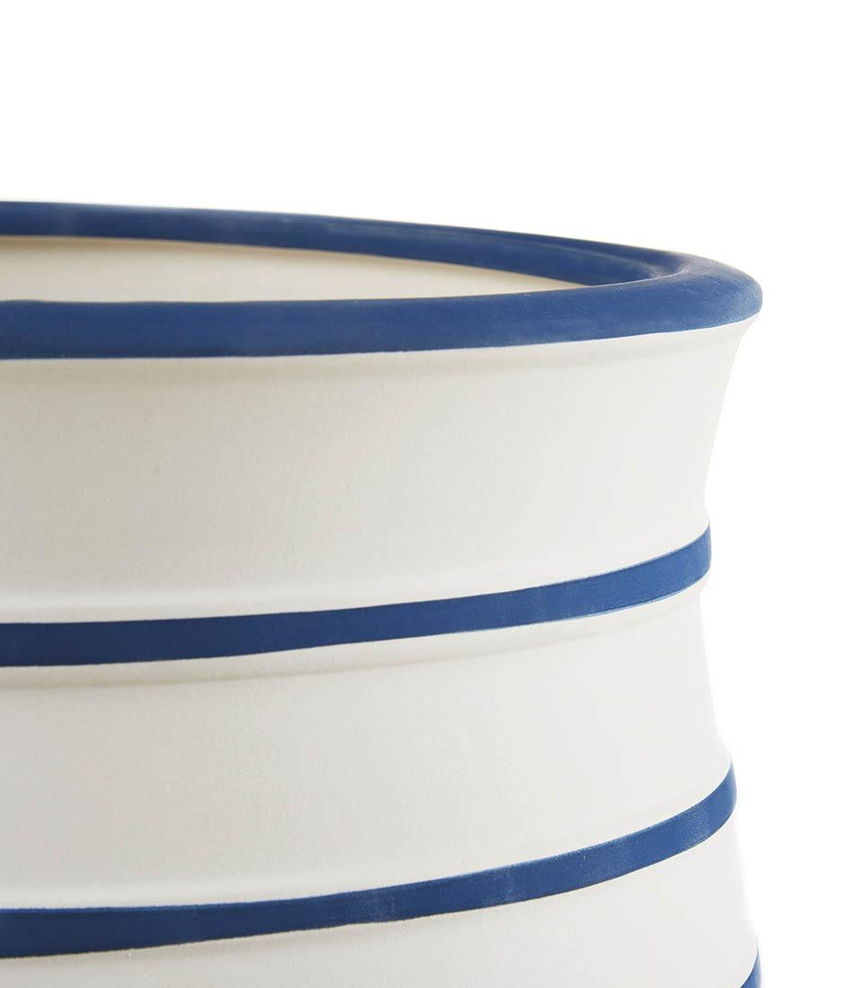 Suport din ceramică albă și albastră cu picioare din lemn. O piesă de mobilier care să vă revigoreze interiorul cu un decor vegetal rafinat. Perfect pentru a se combina cu versiunea înaltă a lumii noastre mediteraneene pentru a crea o atmosferă dinamică și modernă.