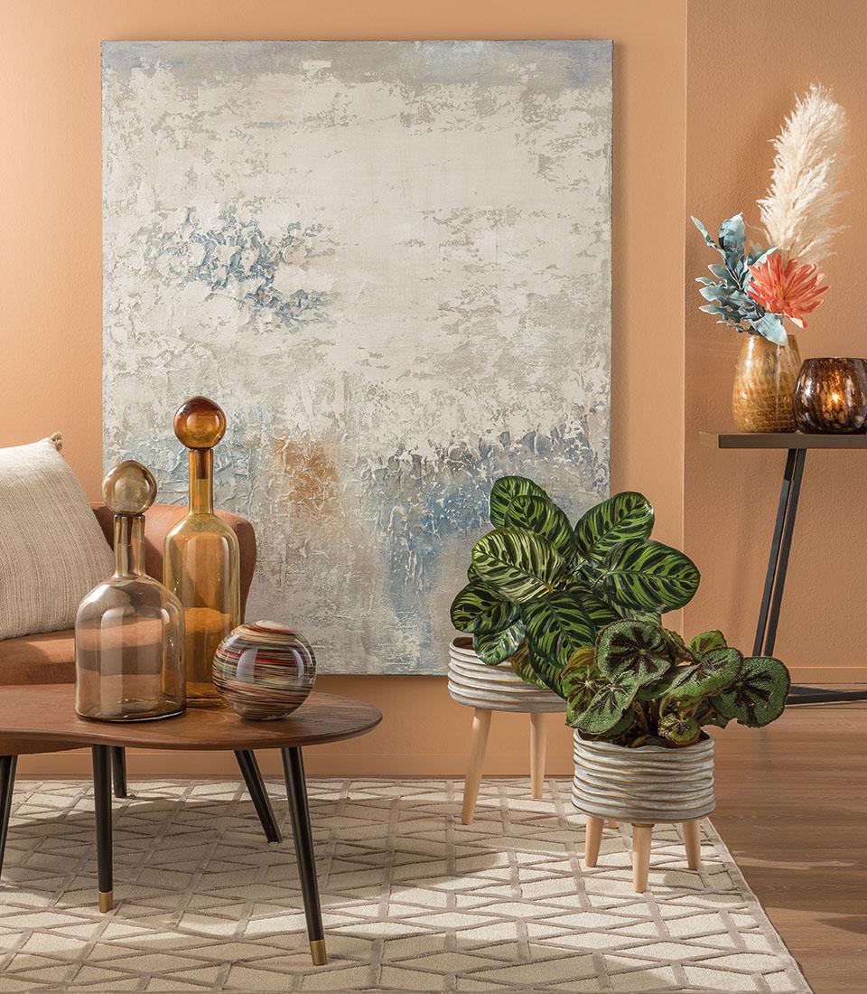 Suport din ceramică lucrată cu picioare din lemn. Piesa de mobilier ideala pentru a crea un colt verde elegant. Pentru a fi combinat cu versiunea înaltă a lumii noastre contemporane pentru a crea un spațiu cu o atmosferă sofisticată.