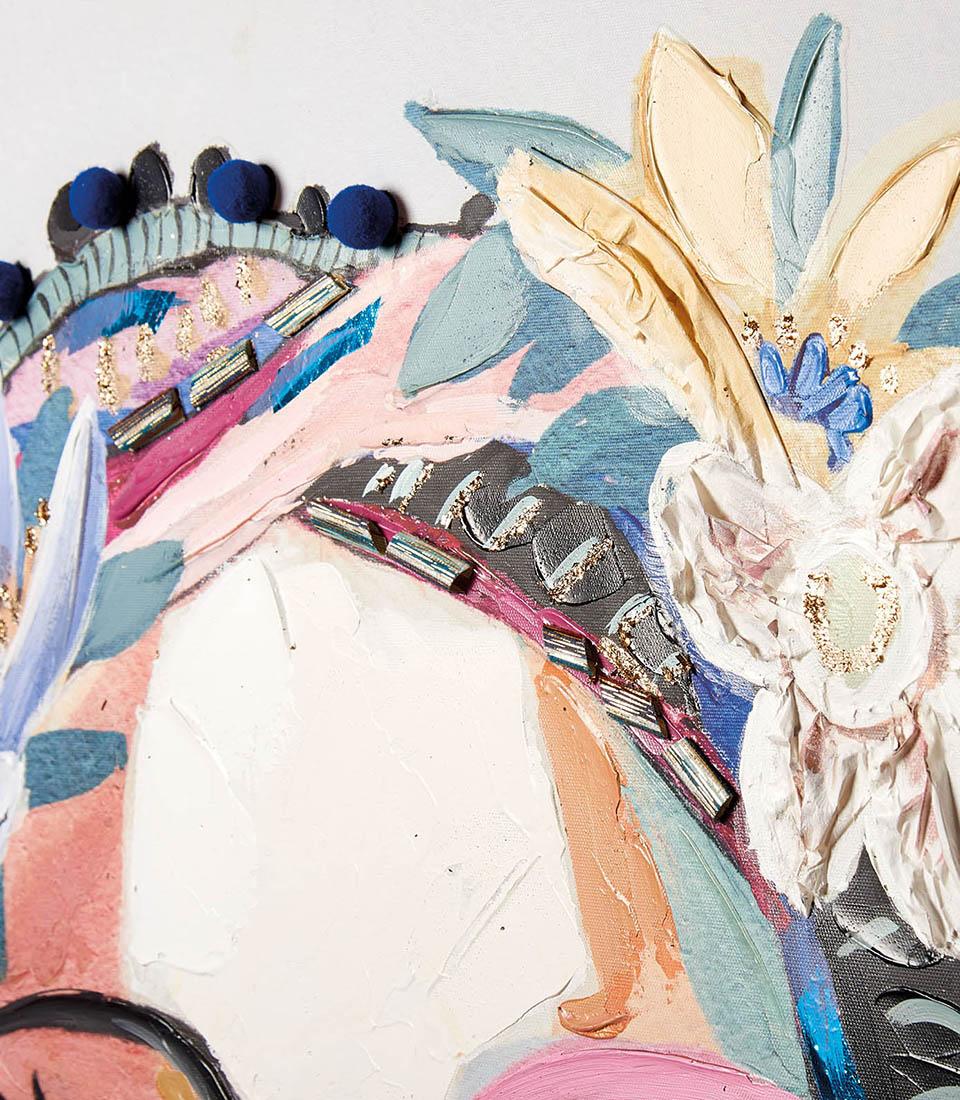 Tablou 80x80 cm realizat cu tehnica serigrafiei pe panza cu aplicatii materiale. Un chip feminin delicat, impodobit cu detalii rafinate. Un tablou care conferă camerelor tale o atmosferă fascinantă Etno Chic.