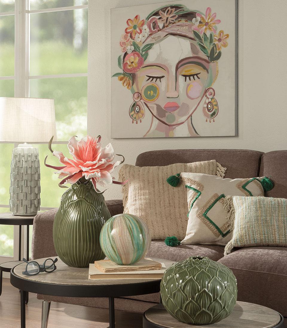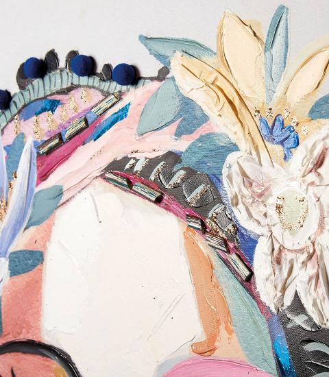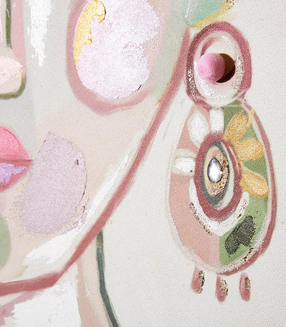 Tablou 80x80 cm, realizat cu tehnica serigrafiei pe panza cu aplicatii materiale. O fata delicata de femeie impodobita cu detalii rafinate. Un tablou care oferă camerelor tale o atmosferă fascinantă Etno Chic.