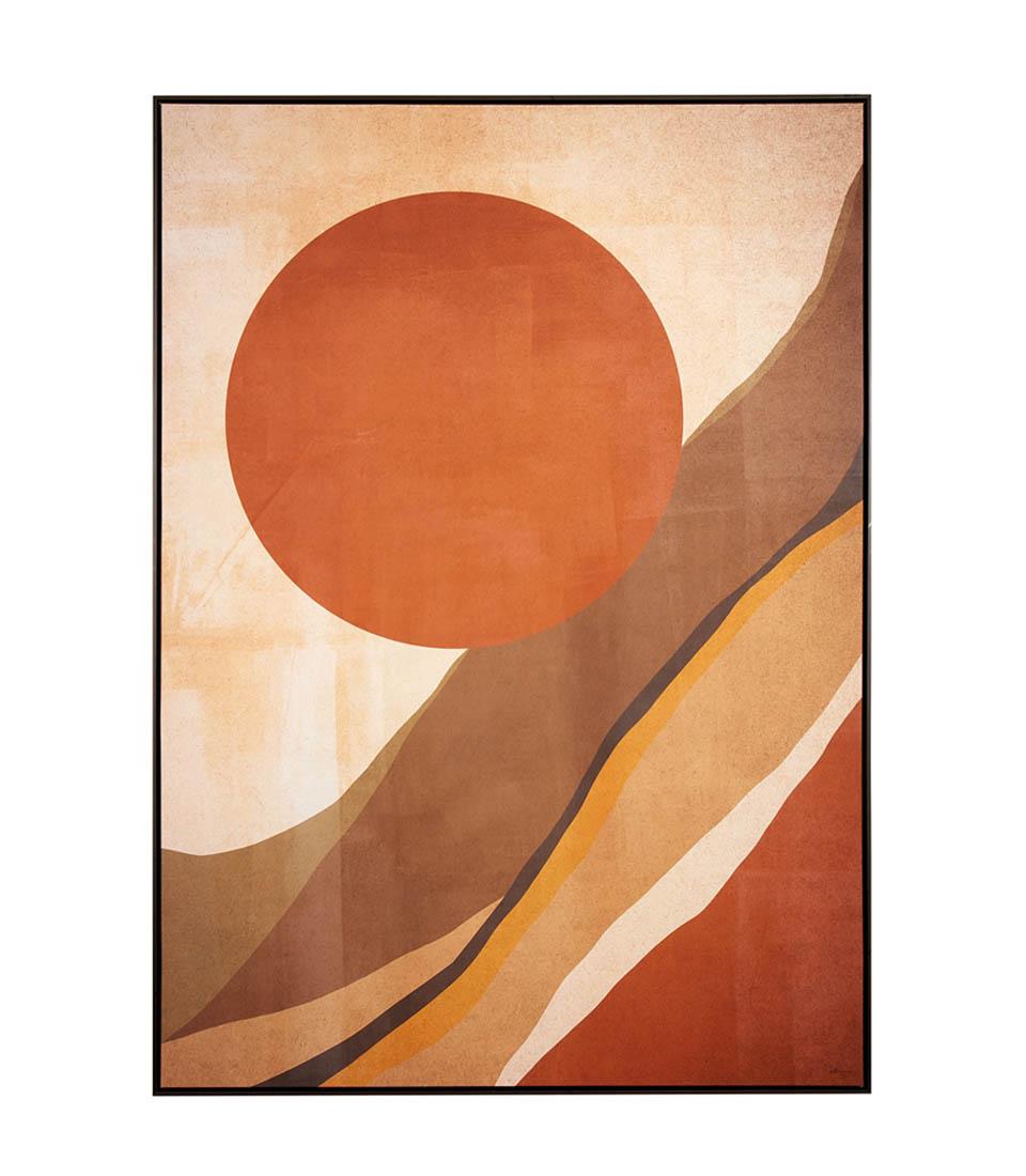 Tablou cu rama realizat cu tehnica serigrafiei pe panza. Un peisaj contemporan cu linii esențiale și stilizate. Culorile hotărâtoare și intense amintesc de nuanțele calde ale naturii. O piesă de mobilier care vă va face camerele elegante și primitoare.
