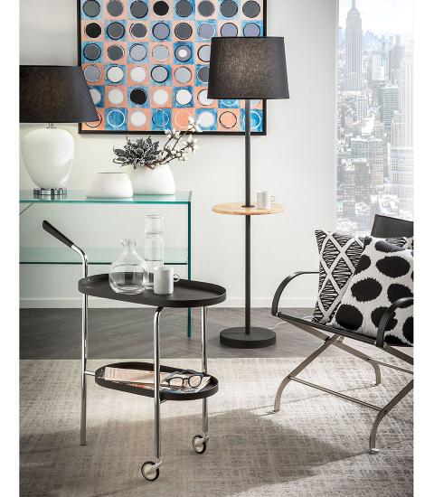 Lampa de masa din sticla cu abajur din material negru. Designul moale, baza metalică și suprafața ușor canelată îi conferă o notă modernă, perfectă pentru cei care preferă eleganța cu o notă modernă.